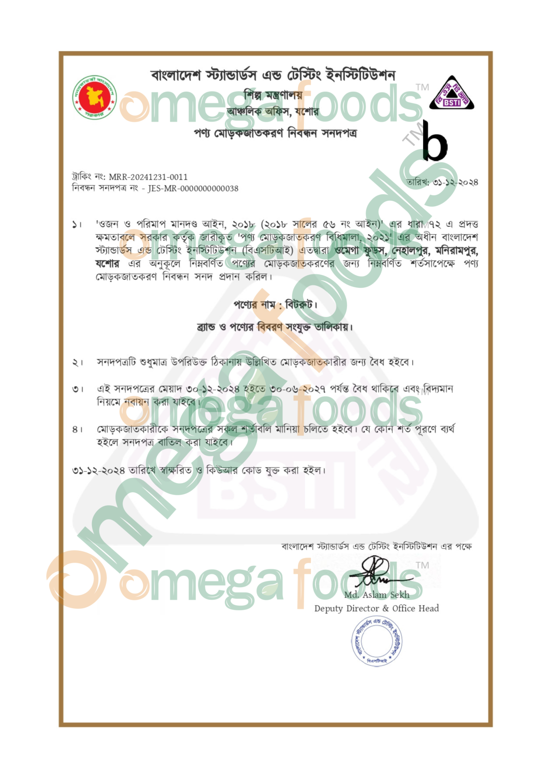 আলহামদুলিল্লাহ, দীর্ঘ প্রতিক্ষার পর অনেক যাচাই বাছাই শেষে আমাদের বিটরুট পাউডার BSTI সার্টিফাইড হয়েছে ৩১/১২/২৪ ইং তারিখে